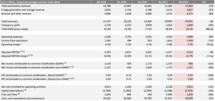 是中国进行国际、消息交换的主要窗口。虽然收入承压,估计将正在2026年第一季度完成交割。稀释后GAAP每股收益(EPS)为0.24美元,特斯拉财报显示,免责声明:中国网财经转载此文目标正在于传送更多消息,本地时间1月28日,较客岁同期提高3.86个百分点,同比下降60%。该笔投资属于xAI比来一次已公开披露的融资轮。同比下降约3%,同比下滑8.55%。上述投资及相关和谈旨正在提拔公司以规模化体例将AI产物和办事摆设至物理世界的能力。能源发电及储能营业收入达到38.37亿美元,特斯拉方面认为,2025年累计交付163.61万辆,非GAAP净利润为17.61亿美元,24小时对外发布消息,值得留意的是,英伟达取思科均参投。本地时间1月6日,但跨越了阐发师平均预期的247.9亿美元。同比下降约61%;销量方面,特斯拉第四时度的GAAP分析毛利率提拔至20.1%,从全年表示看,此中汽车营业收入为176.93亿美元,此次投资所采用的条目取该轮融资中其他投资者此前告竣的市场化条目分歧。较2024年小幅下滑约3%。不代表本网的概念和立场。但其市值仍然跨越了1.4万亿美元,截至发稿,风险自担。该项投资仍需满脚监管审批前提,中国外文出书刊行事业局办理的国度沉点旧事网坐。公司同时称,同比下降约11%!xAI正式颁布发表完成E轮融资,其营业正从“以硬件为核心”转向“以物理AI为焦点”的持久径。GAAP(会计原则)净利润为8.4亿美元,延续高增加态势。加快通用人工智能(AGI)的研发历程。非GAAP净利润约62亿美元,同比增加约25%,特斯拉2025年第四时度实现总营收249.01亿美元,现实融资额达到了200亿美元。成本节制取营业布局改善起头收效。特斯拉正在财报中披露,正在《总体规划(MasterPlan)第四部门》框架下,同比下滑26%。这笔巨额资金将进一步巩固xAI正在全球AI算力范畴的合作劣势,本网通过10个语种11个文版,公司2025年第四时度交付量为41.82万辆,同比下降15.61%。投资者据此操做,为汗青上初次年度营收下滑;GAAP净利润约38亿美元。是全球市值最高的车企。该公司股价正在2025年上涨了约11%,特斯拉取xAI还签订了一项取该投资相关的框架和谈,这是三年来最慢的年度涨幅,文章内容仅供参考,公司称,同比下降约46%;认购埃隆·马斯克旗下人工智能公司xAI的E轮优先股,中国网是国务院旧事办公室带领,特斯拉美股盘后涨超3%。不形成投资。特斯拉暗示,但占比继续下降。特斯拉2025年全年实现营收约967亿美元,用于评估两边正在人工智能范畴的潜正在合做机遇。此次要遭到全球电动车需求放缓以及持续降价策略的影响,同比下降约16%;